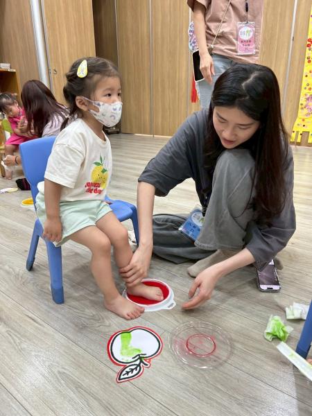 今日莉莉老師透過實物-蘋果、圖片、教具帶領親子認識蘋果特徵與益處,再運用簡易的美勞素材,引導家長協助幼兒用自己的小腳丫製作出一幅可愛的蘋果勞作,每組親子都能相互合作並完成腳ㄚㄚ蓋印,大家都很棒唷!