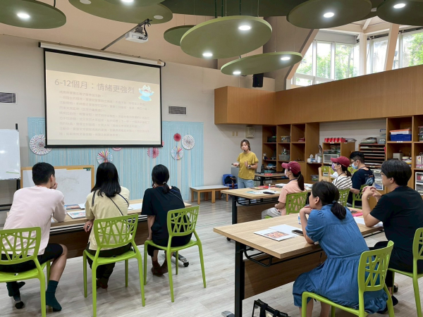 今天老師帶領家長做深呼吸練習和聆聽放鬆音樂,接著透過互動遊戲、影片帶領家長認識情緒及練習情緒表達,並介紹適合嬰幼兒閱讀的書籍,以及如何跟孩子有趣的閱讀,最後製做撕貼畫來送給自己,回家也可以跟孩子一起做喔!
