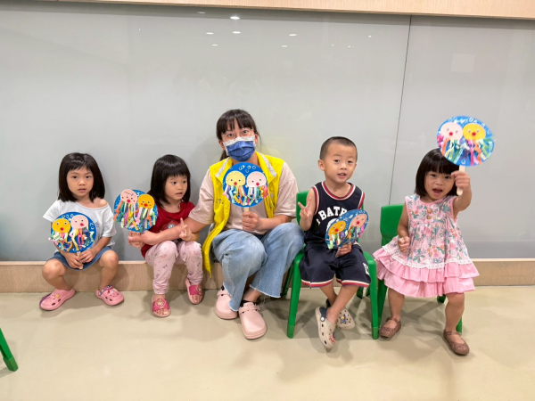 今日老師透過手指謠、繪本故事,帶領幼兒認識繪本中的海裡生物,並延伸繪本中的情境,邀請幼兒進行積木疊高高的平衡遊戲,練習幼兒的手眼協調能力,再使用色紙、紙卡、水彩與動動眼,最後黏貼上冰棒棍,可愛的章魚圓扇完成囉!
