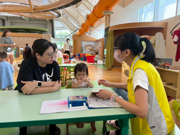 老師們針對館內兒童進行發展篩檢,藉由篩檢幫助家長瞭解孩子目前的發展狀態,也同步提供相關育兒指導諮詢,讓家長知道在家可以如何與孩子互動來增進兒童發展任務。