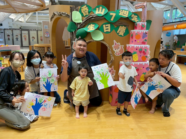 卡比獸老師透過音樂進行小小律動開場,接著透過繪本故事「我家是動物園」引導親子們認識家庭成員,並和親子們玩角色配對遊戲。最後老師帶領大家用手掌蓋印的方式,創作出屬於自己的家庭樹。