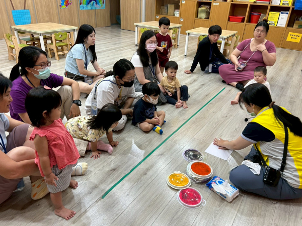 今日莉莉老師運用手指謠拉近與親子間的距離,透過繪本故事認識各種顏色的花卉和種子,最後用簡易美勞素材引導親子製作我的小花園蓋印畫,活動中每組親子都能相互合作並完成勞作,大家都很棒喔!