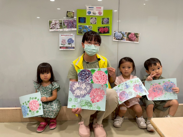 教師透過手指謠與親子互動,藉由圖卡帶領幼兒認識繡球花,圓圓的外型是由什麼組成?它最喜歡?繡球花的顏色會改變?原來繡球花有這麼多有趣的秘密,最後使用手指沾水彩蓋印出繡球花瓣,再使用蠟筆畫出葉子,完成可愛的繡球花蓋印畫。