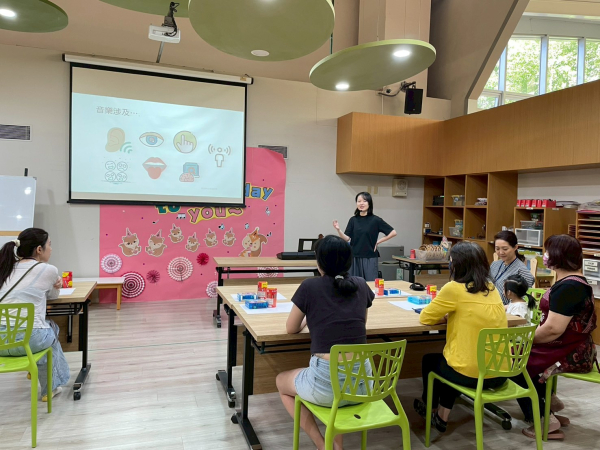 老師先彈奏吉他並與家長互相介紹,接著透過簡報認識大腦發展、依附關係及觸覺的重要性,並教導家長如何運用樂器或是拍打身體的節奏與幼兒互動,最後透過聆聽音樂及繪畫來練習表達,回家後可以跟孩子輪流畫,讓表達可以更清晰及準確。
