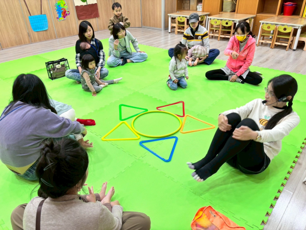 小蜜蜂老師運用繪本和輕快的兒謠帶領親子認識生活中常見的形狀-「三角形、正方形、圓形」,並引導親子運用簡單的瑜珈動作模仿形狀的樣子,活動中每組親子都能一一嘗試變成形狀,大家都非常棒喔!