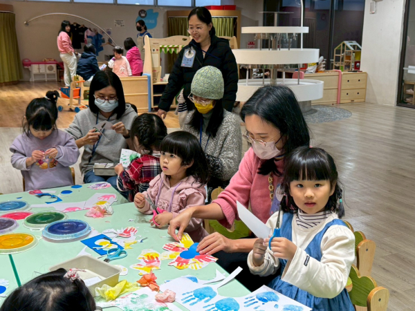 卡比獸老師透過音樂律動暖暖身與認識身體部位,並搭配繪本邀請幼兒化身「小小動物」,模仿小貓咪、企鵝、猴子等角色進行動物模仿秀,每組親子都表現得超厲害!最後利用手掌蓋印製作孔雀,我們的小手手變成美麗的孔雀。