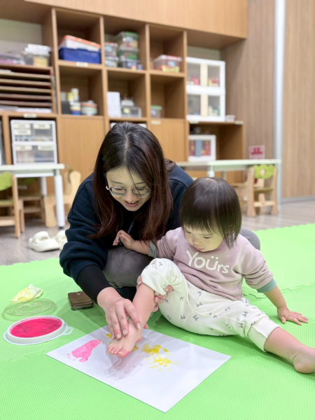 櫻花老師透過繪本教導親子認識手和腳,再透過摸摸不同材質物品,開啟四肢的感官大冒險。最後還開心地玩起蓋印畫,留下超可愛的手腳掌印呢!透過各種遊戲探索手腳的無限可能,這場成長派對真的好有活力呀!