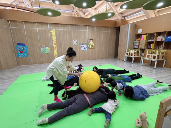 今天幼兒們們變身成一顆顆活潑的小麵糰,跟著雯雯老師一起動手做披薩,先輕輕塗上油、撒上麵粉,感受麵糰慢慢膨脹、發酵完成;接著透過伸展身體的動作,讓麵糰變得柔軟又有彈性,做成Q彈的披薩皮,小小廚師們輪流打蛋,再化身成小小滾輪,一起完成美味的披薩!回家後,也鼓勵家長將課堂上學到的瑜珈動作轉化成趣味親子活動,增加親子互動的樂趣。