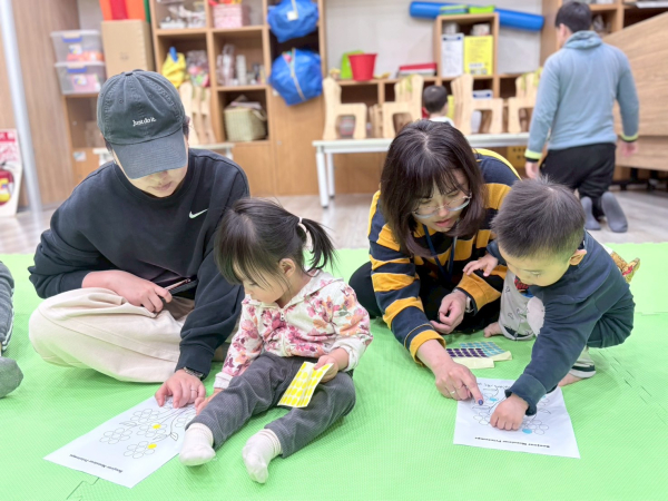 櫻花老師帶領親子透過繪本《花園列車出發了》認識花與花園。大家化身為「賞花列車」的乘客開心出發去賞花,還運用絲巾摺出小花,讓親子進行體能互動遊戲。最後親子共同完成「花朵圓點貼畫」,孩子們在繽紛的創作與遊戲中,感受賞花的樂趣呢!