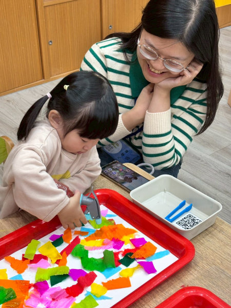 太陽老師先使用情緒圖卡帶領幼兒認識不同的心情,幫助孩子了解並表達自己的情緒。接著施展小魔法,在白白的圖畫紙上放上代表各種情緒的顏色,再噴上魔法水後,神奇的出現了繽紛的圖案。活動中孩子們都非常專心、充滿創意,每個人都完成了屬於自己的作品,大家真的都很厲害呦!
