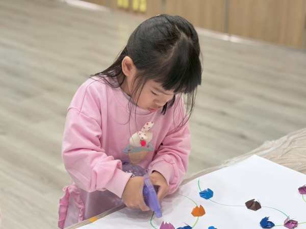 小玉老師帶來有趣的繪本,邀請小朋友化身成小小園丁,一起幫忙「種種子」。親子們利用不同形狀的紙花進行繪畫與黏貼,再噴上魔法水觀察紙花慢慢綻放,最後使用吸管沾顏料在白紙上蓋出一朵朵小花,完成屬於自己的美麗花園,是不是很美呢!