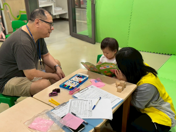老師們針對館內兒童進行發展篩檢,藉由篩檢幫助家長瞭解孩子目前的發展狀態,也同步提供相關育兒指導諮詢,讓家長知道在家可以如何與孩子互動來增進兒童發展任務。