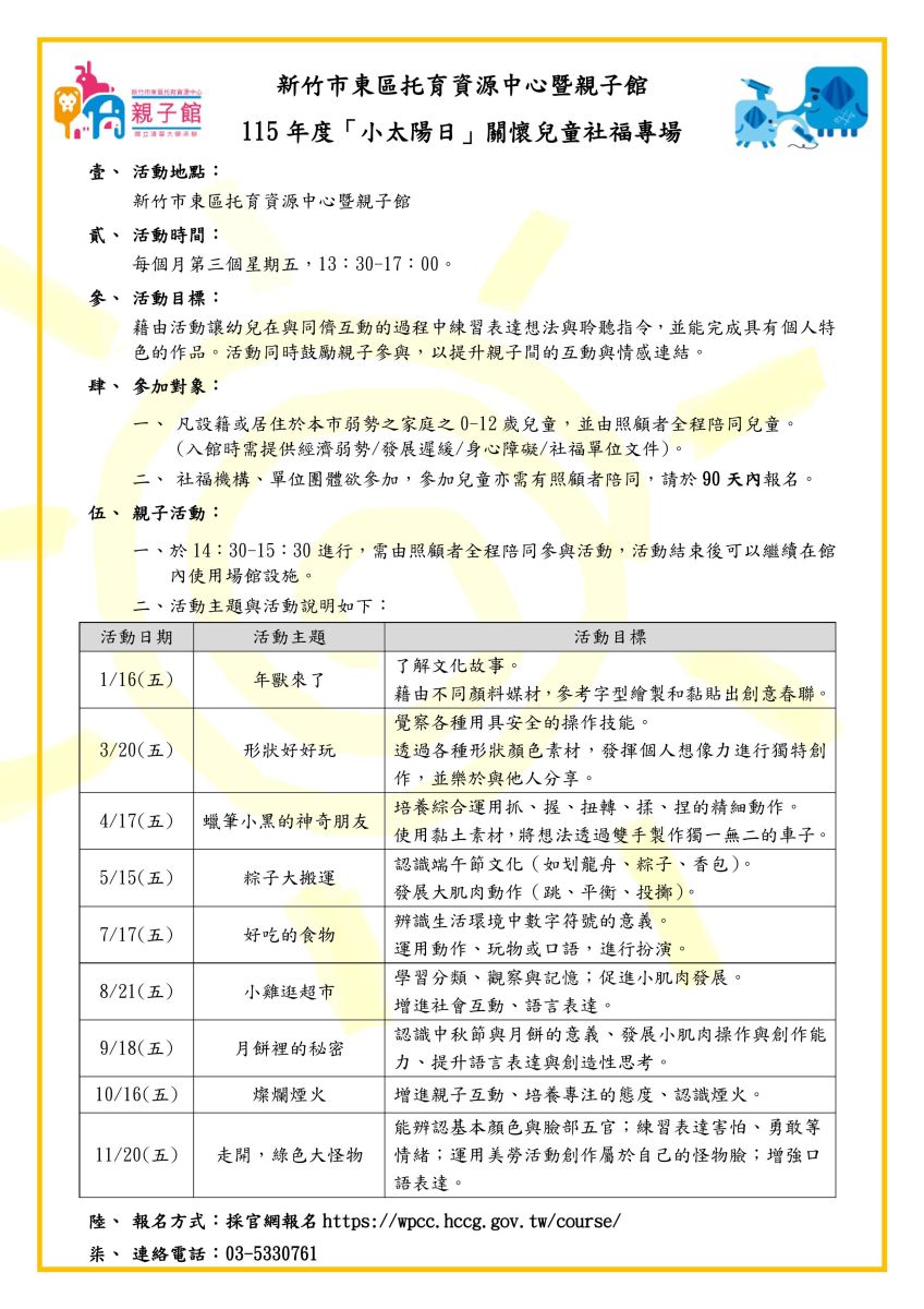 每月份兒童福利專場-小太陽日有課程活動哦~~~
